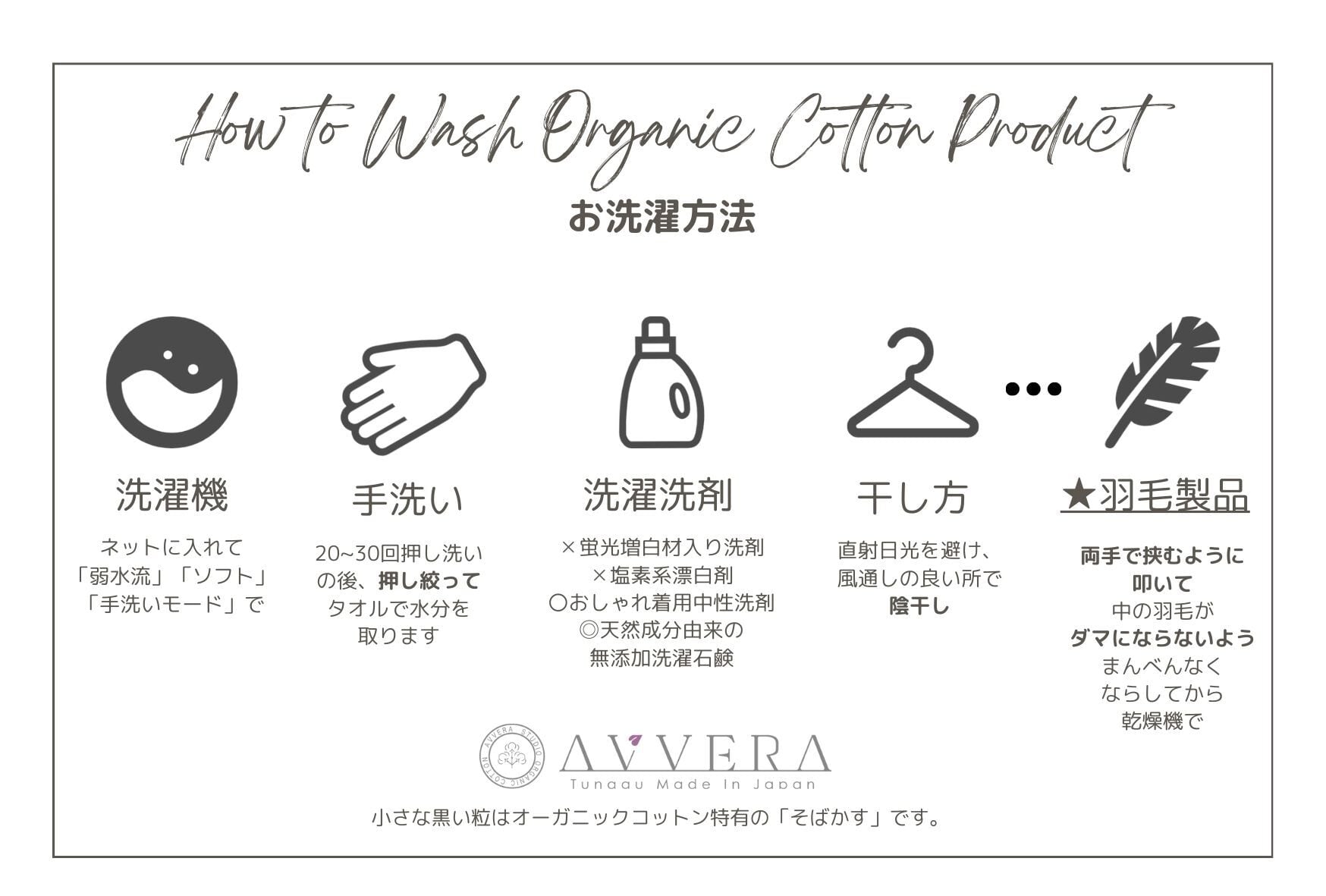 漂白剤・柔軟剤は、オーガニックコットンの生地を傷めたり、毛羽立ちの原因となる恐れがございますので、ご使用をお控えください。